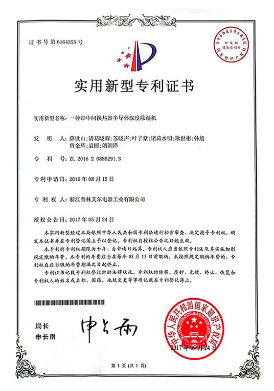 2017年一種帶中間換熱器半導體深度除濕機實用新型專利證書