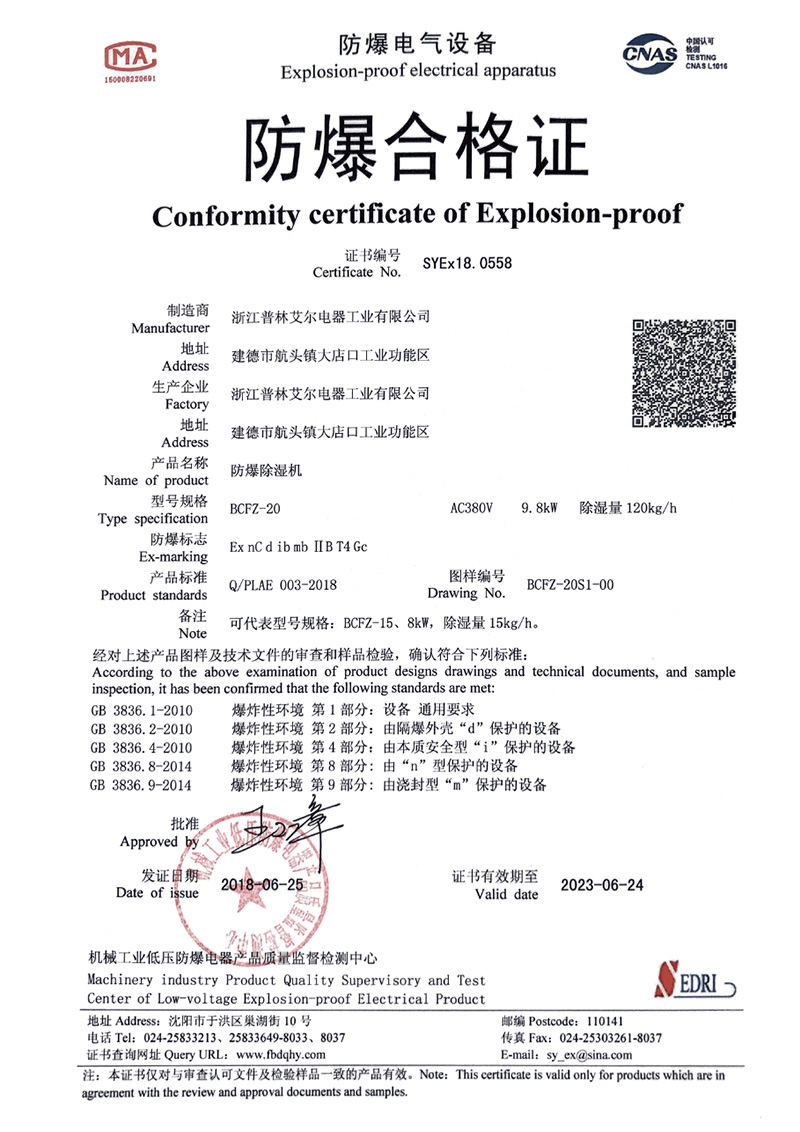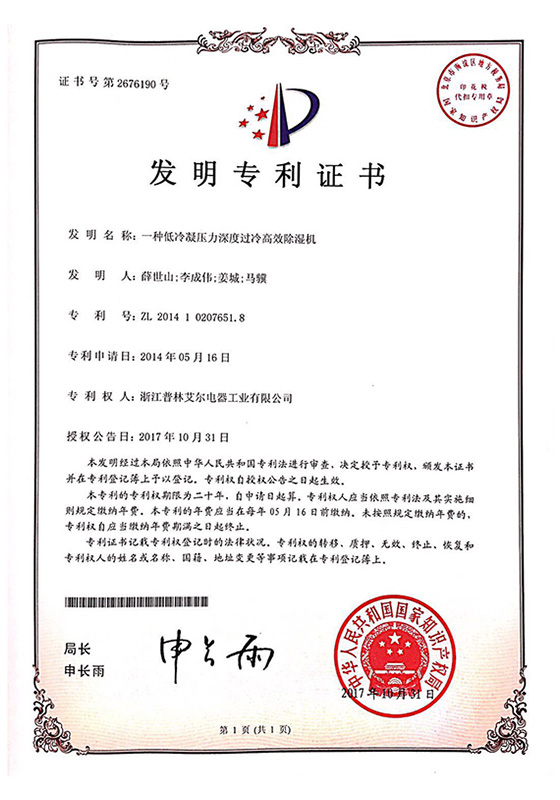2017年一種低冷凝壓力深度過冷高效除濕機發明專利證書