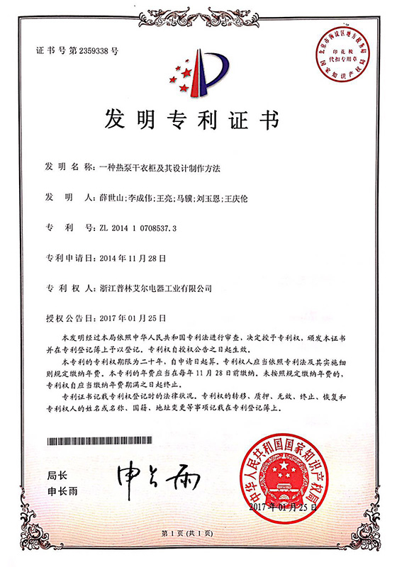 2017年一種深度除濕設備側向安置熱泵干衣柜發明專利證書