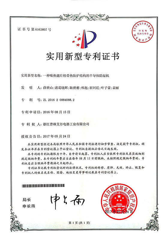 2017年一種吸熱翅片組帶熱防護結構的半導體除濕機實用新型專利證書