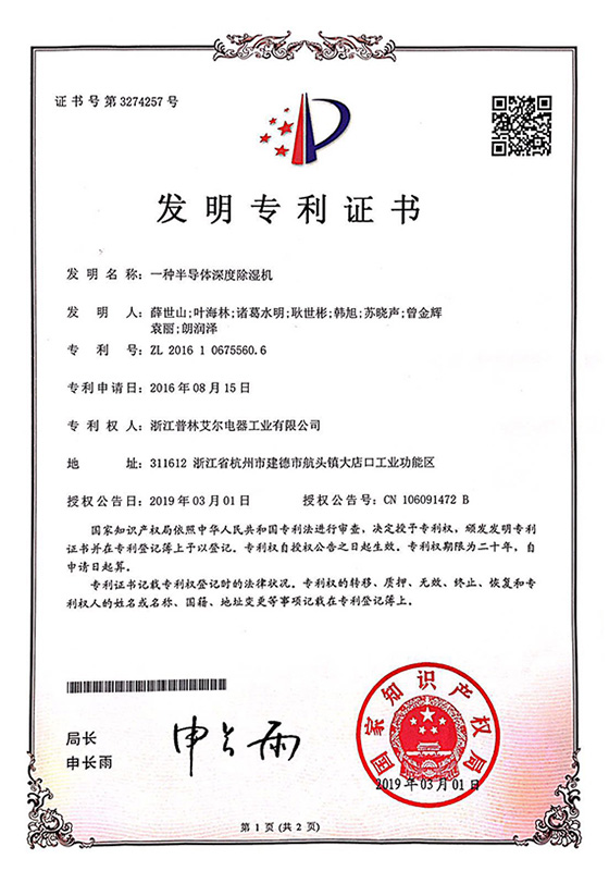 2019年一種半導體深度除濕機發明專利證書