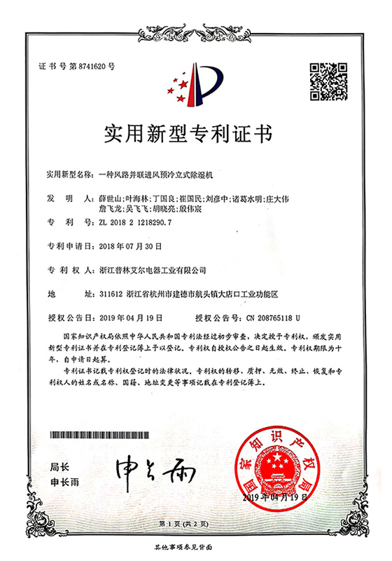 2019年一種風路并聯進風預冷立式除濕機實用新型專利證書