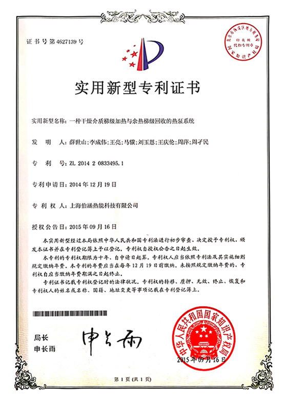 2015年一種干燥介質梯級加熱與余熱梯級回收的熱泵系統實用新型專利證書