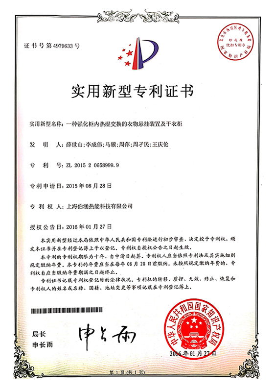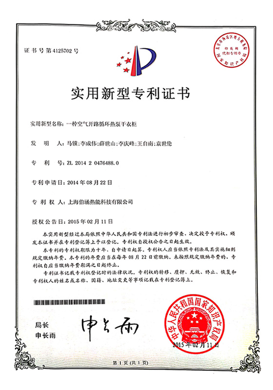 2015年一種空氣開路循環熱泵干衣柜實用新型專利證書