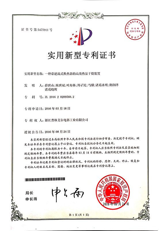 2016年一種帶逆流式換熱器的高效熱泵干燥裝置實用新型專利證書