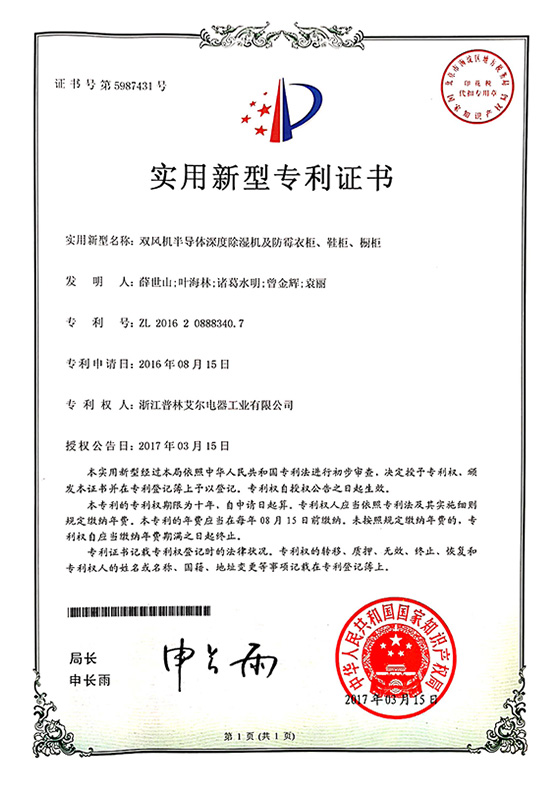 2017年雙風機半導體深度除濕機及防霉衣柜、鞋柜、櫥柜實用新型專利證書