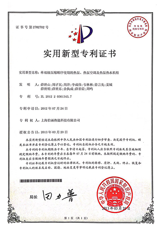 2013年單雙級(jí)壓縮順序使用的熱泵、熱泵空調(diào)及熱泵熱水機(jī)組實(shí)用新型專利證書(shū)