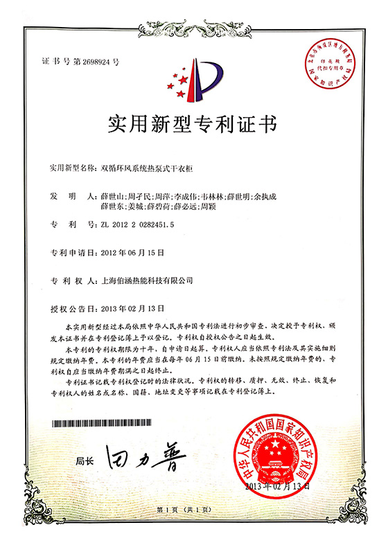 2013年雙循環(huán)風(fēng)系統(tǒng)熱泵式干衣柜實(shí)用新型專利證書(shū)