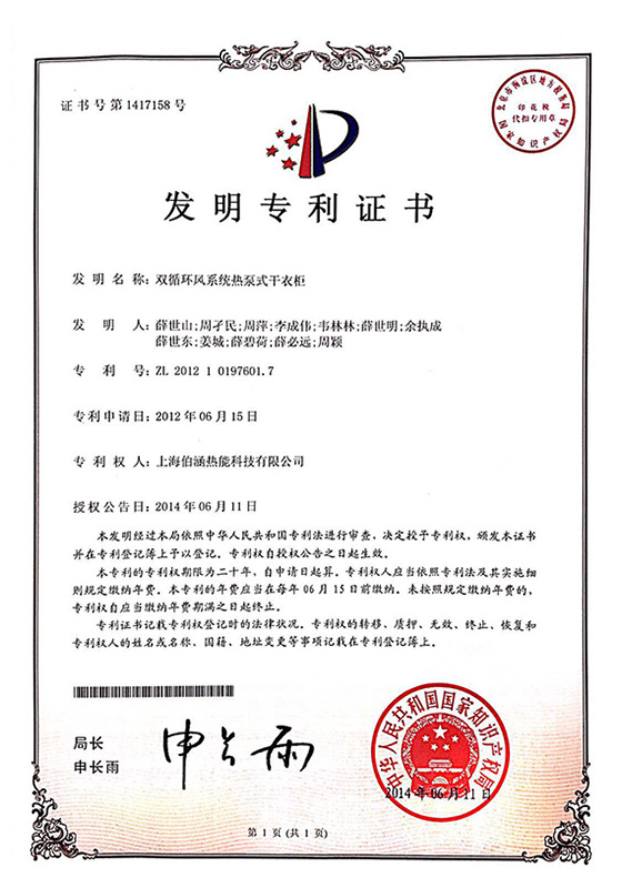 2014年雙循環(huán)風(fēng)系統(tǒng)熱泵式干衣柜發(fā)明專利證書(shū)