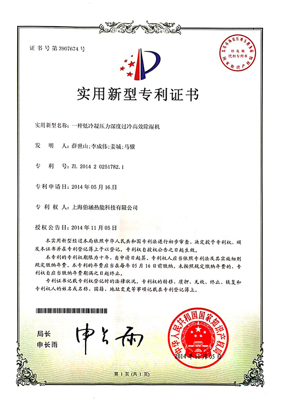 2014年一種低冷凝壓力深度過(guò)冷高效除濕機(jī)實(shí)用新型專利證書(shū)